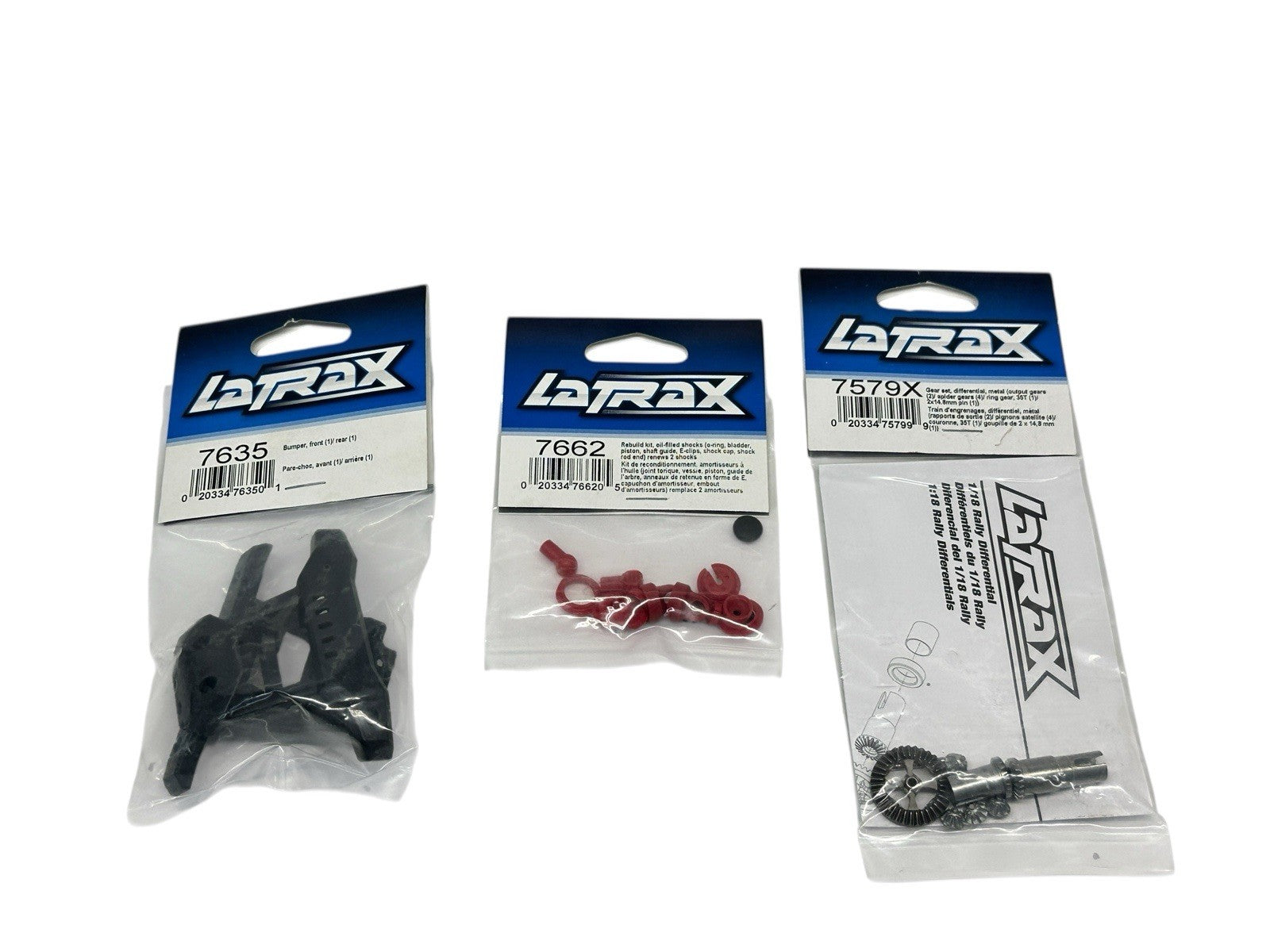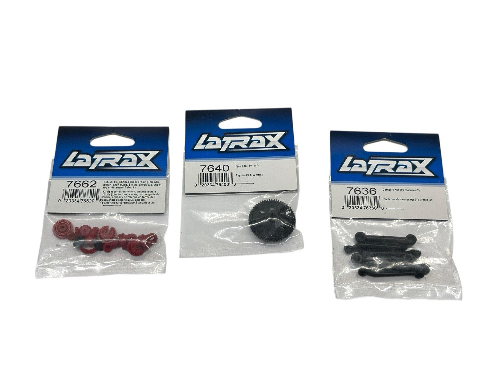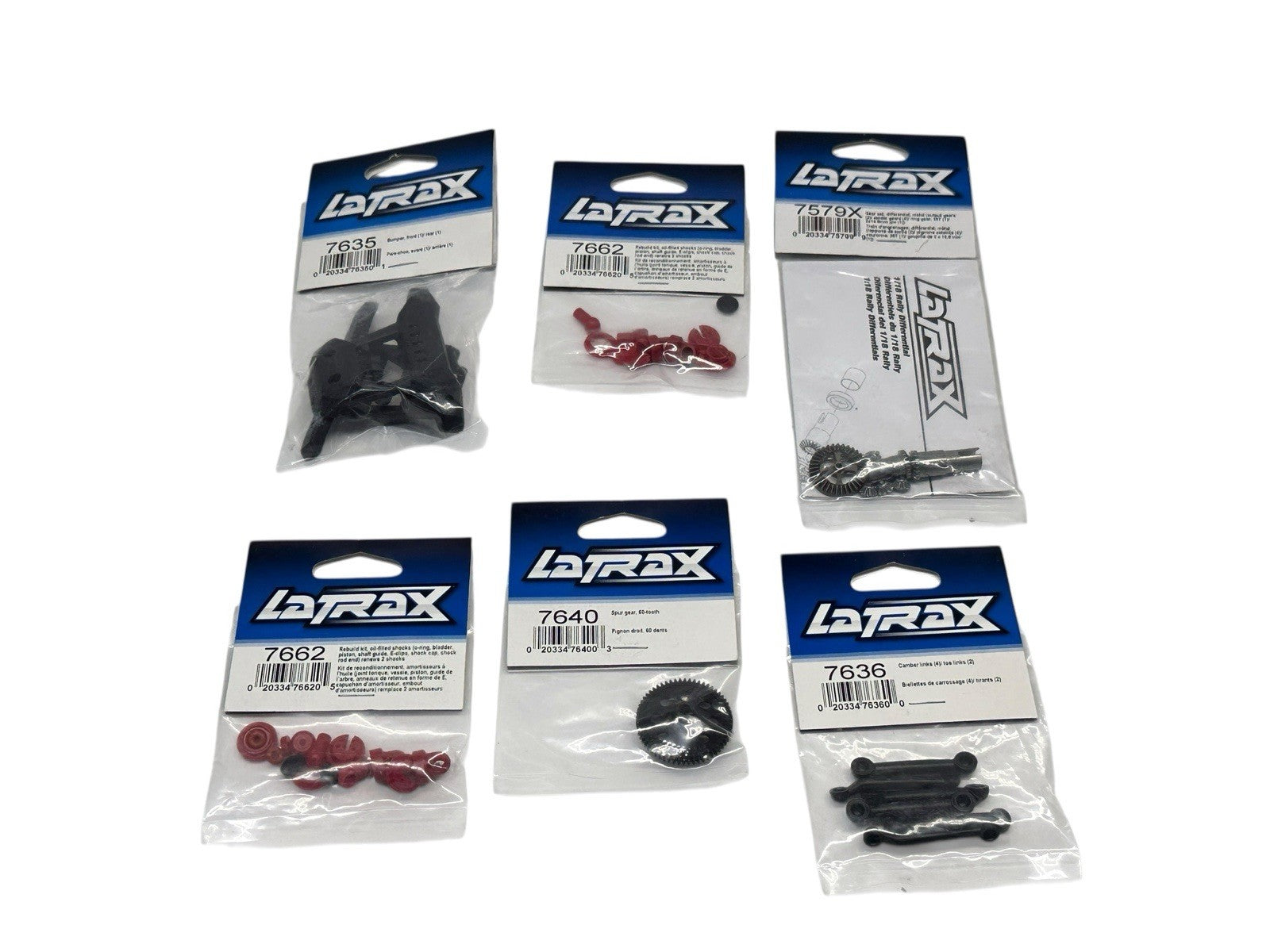 This listing includes a lot of six brand-new Traxxas LaTrax parts. Each item is new in its original, unopened packaging. The total retail value of the lot is approximately $30.