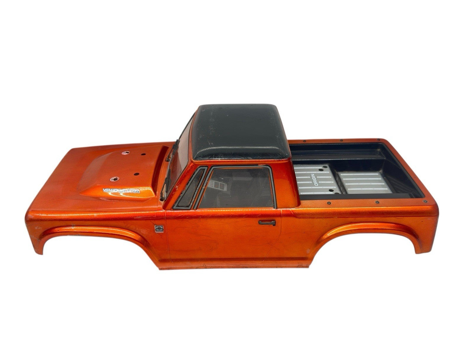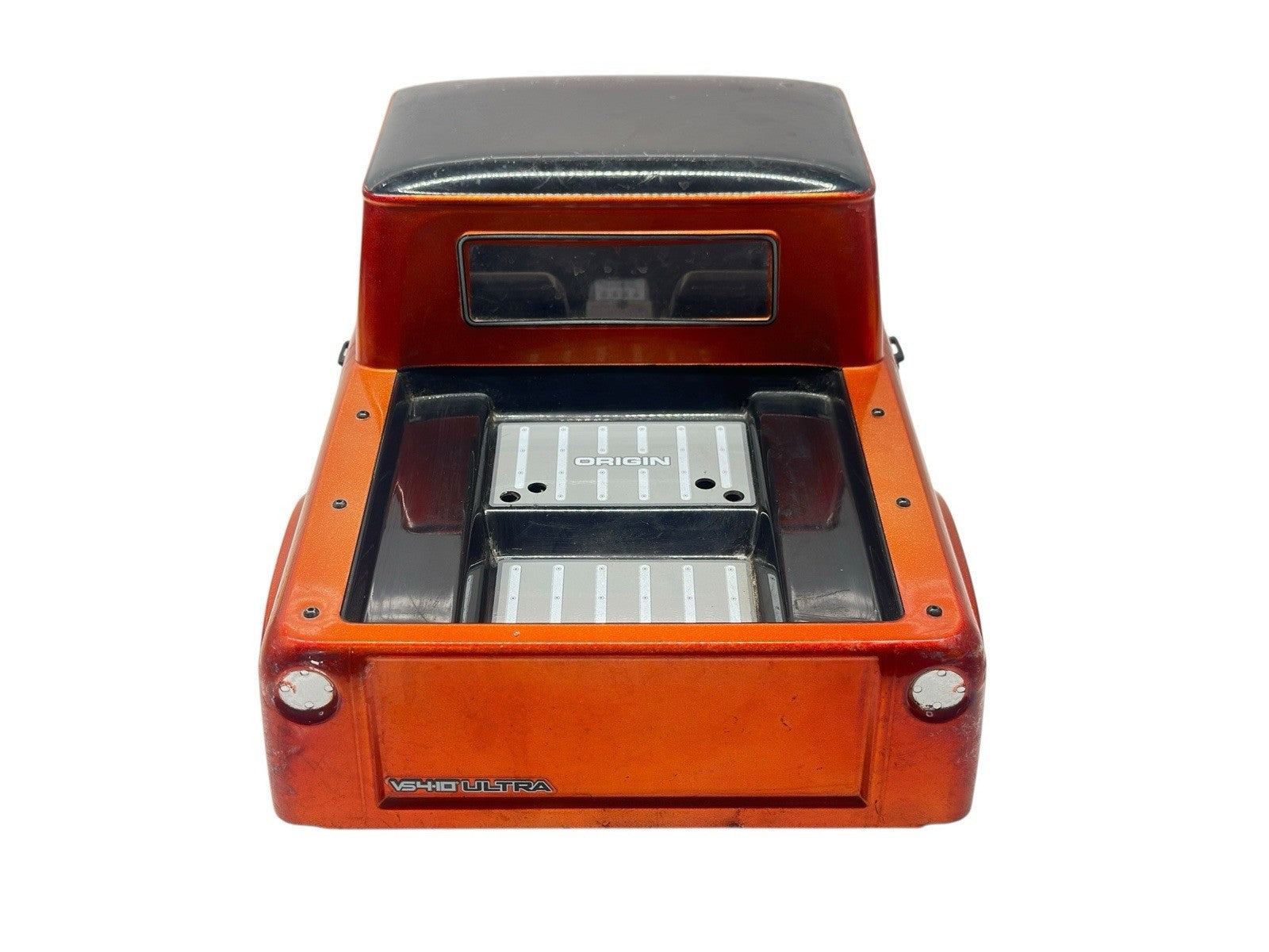 This Vanquish Origin Halfcab 1/10 scale crawler body is finished in orange paint and is in good condition overall. The body shows normal wear from use. The interior has a few minor wear-related cracks/holes, and there is one small crack approximately 1/4 inch in length on body front corner. This crack is minor and does not significantly affect fitment or usability.