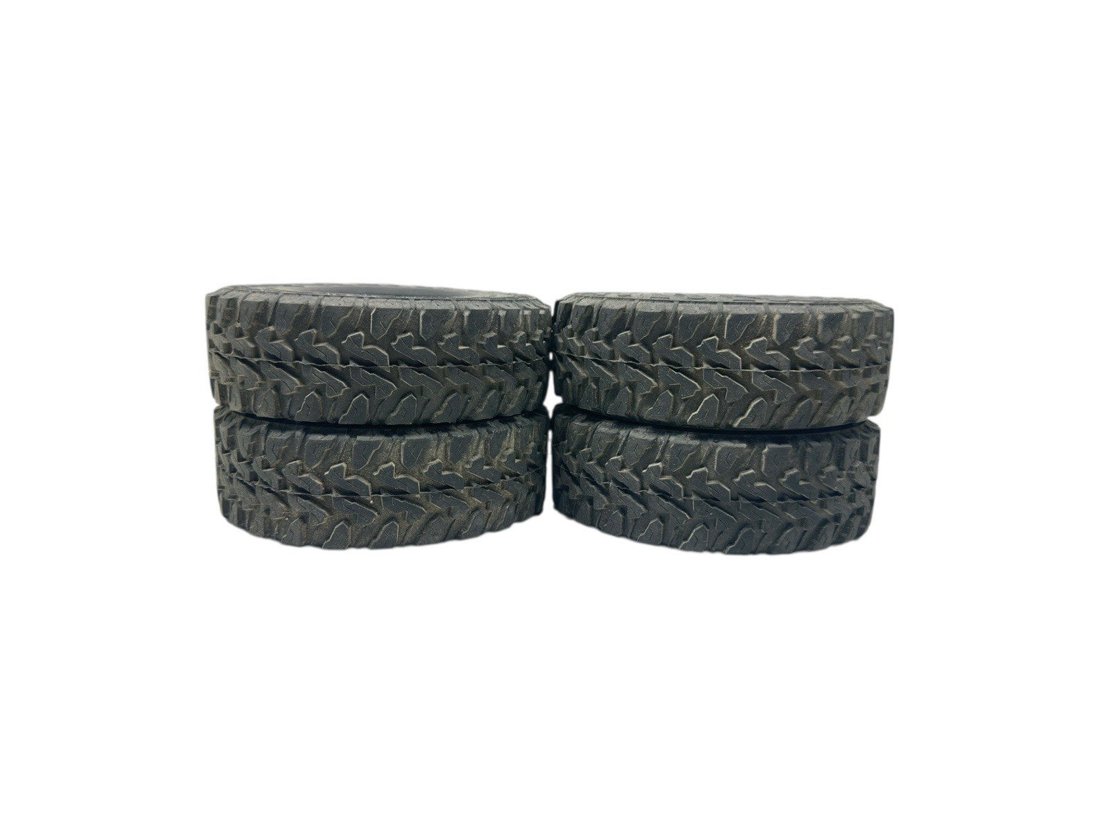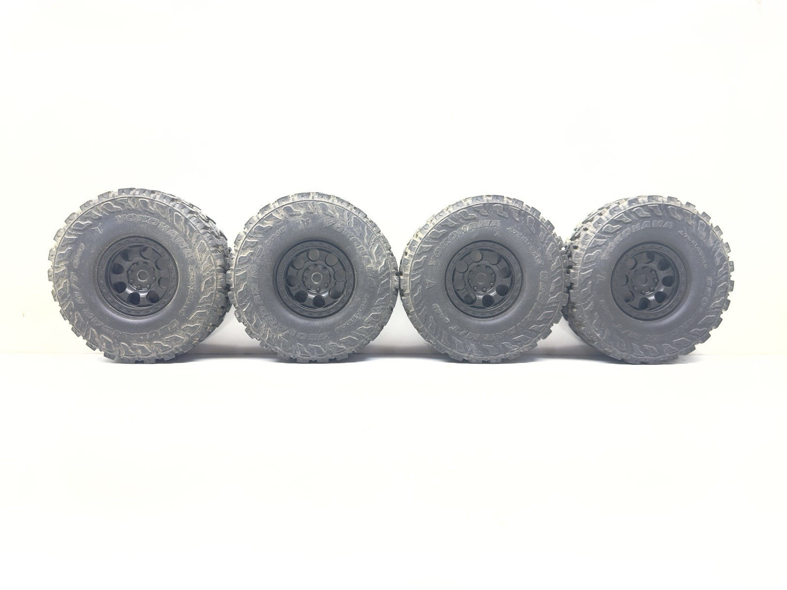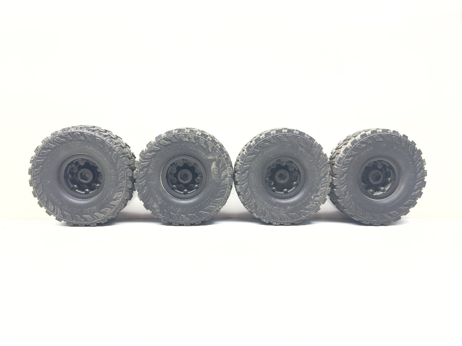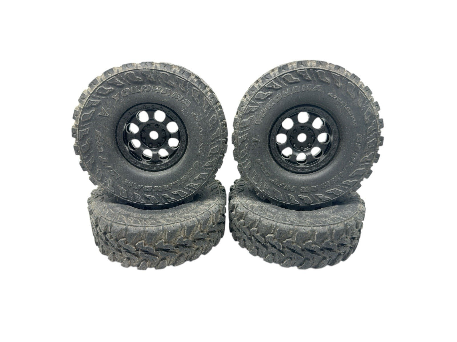 This is a used set of Vanquish Yokohama Geolandar M/T 1.9 tires mounted on KMC KM237 wheels. Overall, the set is in good condition. The tires show great tread life remaining, and the wheel hexes are in perfect condition with no issues.